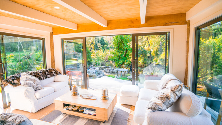 The accommodation consists of a large single room with kitchen, bedroom and lounging all sharing the same space. Large glass sliding doors open out from the sitting area onto a surrounding deck. A bathroom, with a luxurious, deep bathtub is accessed from the deck outside. An outdoor fire-place and beautifully landscaped sitting area, sits right next to the Rockwood Stream that runs immediately in front of the Summer House. You can hear the gentle flow of the water over the rocks from your bed. The bird-life surrounding the summer house is incredible. The bush walk on the property takes you through 100 acres of native bush, and the beautiful woodland garden of the nearby, historical Rockwood homestead is a delight to explore.