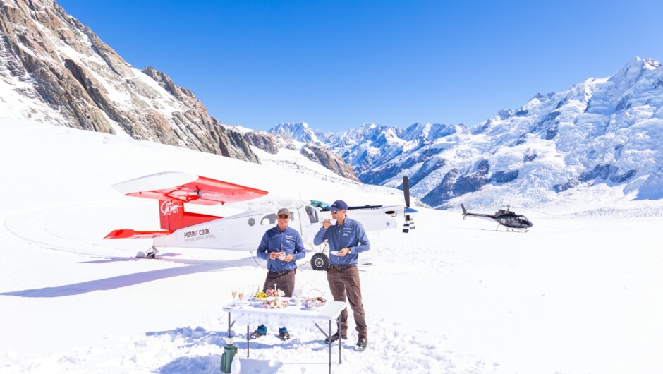 An Exclusive Picnic Amongst the Peaks experience via the only ski plane in the Southern Hemisphere to the iconic Tasman Glacier, where you’ll savour a delicious picnic lunch on the snow, all while surrounded by the majestic views of Aoraki/Mt Cook.