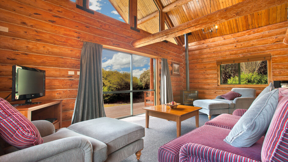 The open architecture of the lodge reflects the vastness of the Fiordland National Park. High ceilings, oregon logs, full trunk pillars and massive riverstone fireplaces provide a warm and spacious environment with a sense of solidity and style.