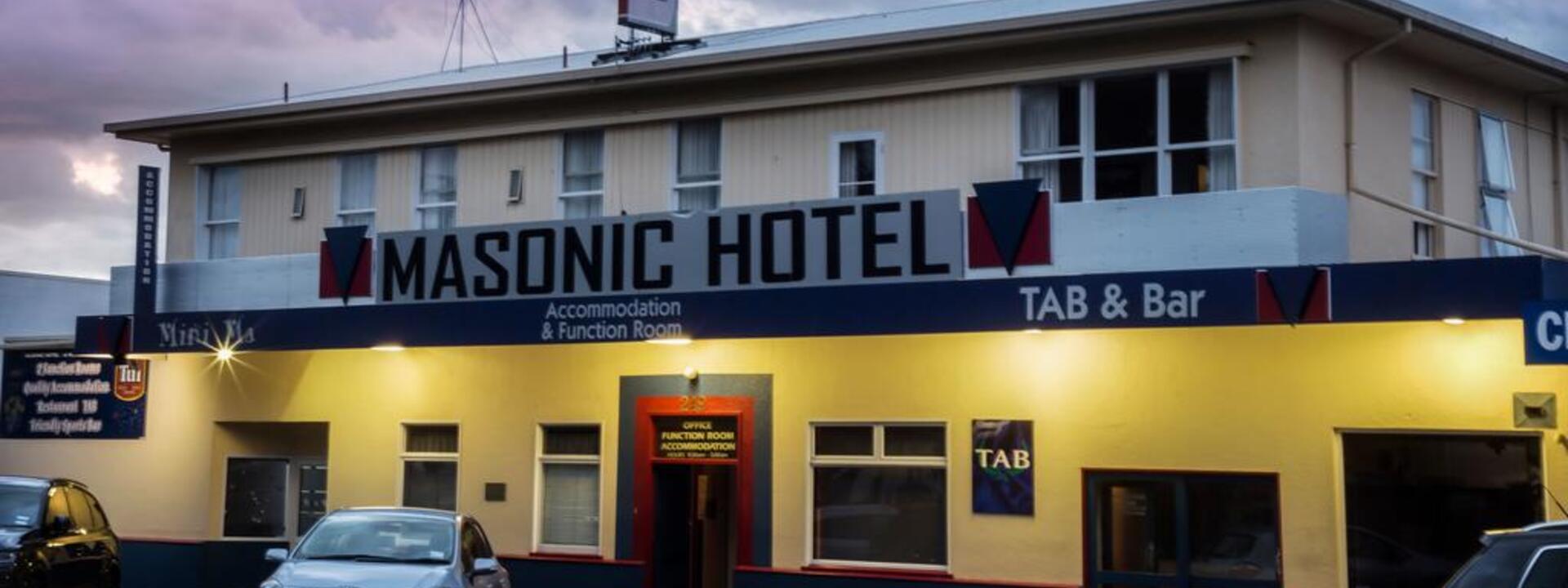 Masonic Hotel is located in Palmerston North, who provide accommodation, restaurant, bar, TAB (betting) and function room.