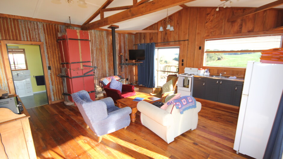Converted Woolshed, retaining lots of original kiwi features including wool press, corrugated iron, and native timber. Wraparound deck with all day sun. One double room (queen bed) and one twin. Full kitchen - stove, fridge freezer, kettle, toaster, panini press, coffee plunger, log burner; TV, DVD, freeview, and large selection of movies; WIFI Bathroom and washing machine. Walk on farm tracks to the end of the farm, enjoying the views and birdlife on the way. Explore our ponds and covenanted 40 acres of Native Bush. The 3 top words our visitors use to describe The Woolshed? Comfortable, peaceful, and cosy.