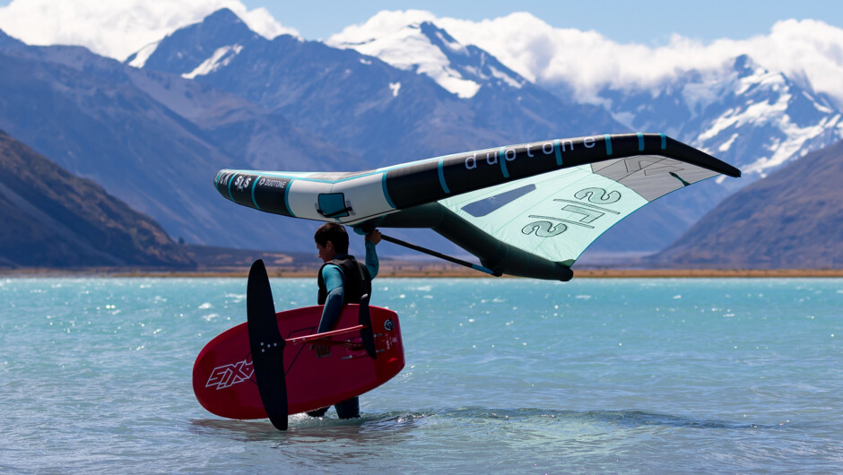 Your six nights fully catered wingfoil experience is based in the heart of the South Island. You are hosted in the peaceful settlement of Twizel, centrally located to easily access five different lakes. From crystal clear waters of Lake Ohau, Aviemore and Benmore to turquoise waters of Lake Pukaki and Tekapo, all with a breathtaking backdrop. We aim to explore a different spot each day. The timing of your trip is tailored to capture the summer thermal weather conditions, maximising your water time. During your time with us, all meals will be fully catered for (breakfast, lunch, dinner, snack on the beach). Transport for you and your gear is included (from Queenstown).